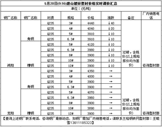 5月27日(9:40)唐山型材厂角钢实时调价汇总
