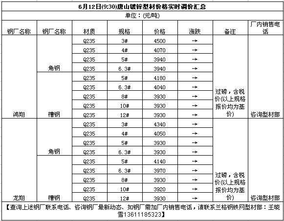 6月12日(9:17)唐山型材厂槽钢实时调价汇总