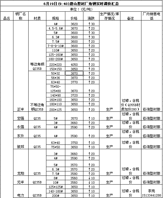 6月19日(9:40)唐山型材厂角钢实时调价汇总