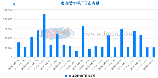 今日唐型价格普遍稳,部分有小幅下调10,需求仍没有跟进,整体成交偏弱,操作谨慎。据兰格钢铁网统计,23日截止16点统计唐山24家型材钢厂今日成交总量2.6万吨,减140吨,其中,工字钢4380吨,增6800吨;槽钢8500吨,减750吨;角钢13500吨,减70吨。 | 唐山型材日成交量 | | 6.23 本周二 | 2.6 | | 6.22 本周一 | 2.6 | | 6.19 上周五 | 5.7 | | 6.18 上周四 | 6.9 | | 6.17 上周三 | 2.8 | | 6.16 上周二 | 7.4 | | 6.15 上周一 | 2.6 | | 单位:(万吨) |