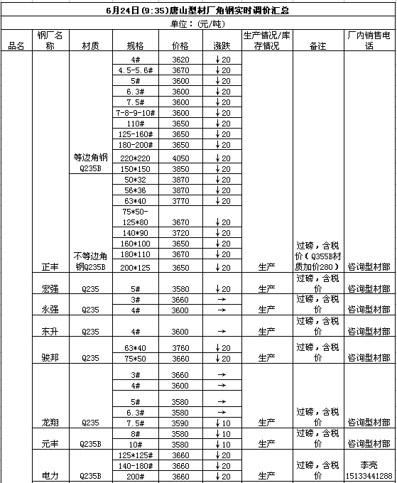 6月24日(9:35)唐山型材厂角钢实时调价汇总