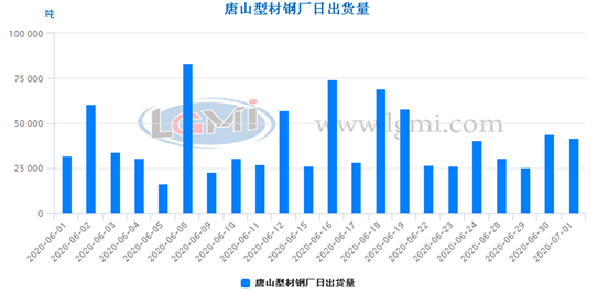 今日唐型价格普遍为稳,轧钢厂陆续生产,询价偏多,低价资源成交有所放量。据兰格钢铁网统计,1日截止16点统计唐山24家型材钢厂今日成交总量4.1万吨,减2330吨,其中,工字钢8300吨,增320吨;槽钢12350吨,减5750吨;角钢21000吨,增3100吨。 | 唐山型材日成交量 | | 7.1 本周三 | 4.1 | | 6.30 本周二 | 4.3 | | 6.29 本周一 | 2.5 | | 6.28 上周日 | 3 | | 6.24 上周三 | 4 | | 6.23 上周二 | 2.6 | | 6.22 上周一 | 2.6 | | 单位:(万吨) |