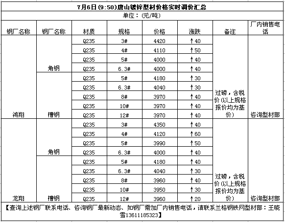7月6日(9:35)唐山型材厂角钢实时调价汇总