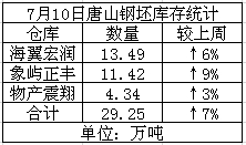 唐山钢坯库存调研:截止7月10日统计三家唐山仓库钢坯库存约29.25万吨,较上周增1.94万吨,增幅7%。海翼宏润钢坯库存13.49万吨;象屿正丰钢坯库存11.42万吨;物产震翔钢坯库存4.34万吨;