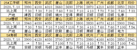 据兰格云商平台监测数据显示:现国内重点中心城市25#工字钢的平均价格是3920元(吨价,下同),较上周市场价格涨33元;25#槽钢平均价格是3941元,较上周市场价格涨54元;5#角钢平均价格是3941元,较上周市场价格涨41元;200*200H型钢平均价格是3801元,较上周市场价格涨25元。