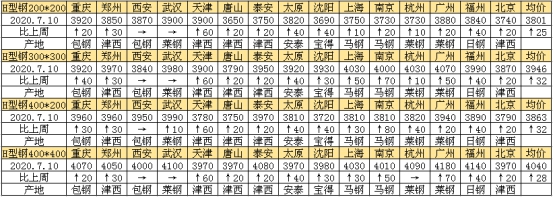 本周(7.6-7.10)国内型材市场价格持续走高。初期,受环保限产影响,唐山轧钢企业陆续停产检修,再加上7月中旬政策通知停产至月底,刺激下游商户采购情绪,市场交投氛围主要还是集中在低价资源。而随着成本端持续上涨以及期钢盘面强势拉高推波助澜之下市场价格竹节攀升,据商家反馈因南方持续的强降雨天气市场到货情况缓慢,型钢紧俏资源有缺货情况,商家普遍有意挺价销售。
