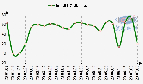 唐山型材开工率调研:截止7月9日统计唐山27家型钢厂40条生产线,停产或检修32条,开工率约为20%。唐山再次下达环保限产通知延期至13日,钢厂开工率继续保持低位。