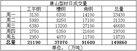 唐山型材厂出货量统计:唐山型材厂出货量统计:截止7.10日唐山型材轧钢厂出货总量14.9万吨,较上周(6.28-7.3)减少10万吨,下降40%。