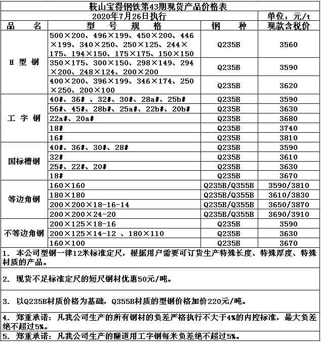 7月27日(9点)唐山型材厂H型钢实时调价汇总