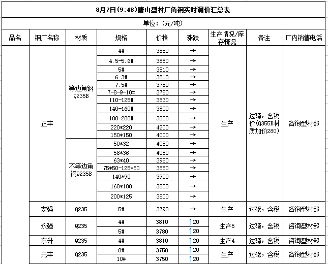8月7日(9:48)唐山型材厂角钢实时调价汇总表
