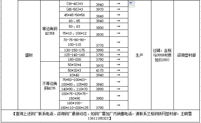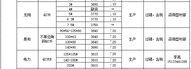 8月10日(9:30)唐山型材厂角钢实时调价汇总