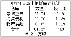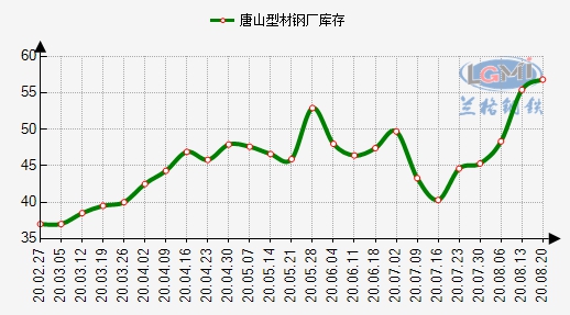 唐山型材成品库存调研:截止20日统计24家钢厂成品材库存约56.8万吨,较(8月13日)增加1.4万吨,上升2%,淡季影响明显,本周出货情况整体较冷清,故本周库存继续攀升。