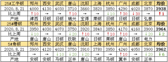 据兰格云商平台监测数据显示:现国内重点中心城市25#工字钢的平均价格是3938元(吨价,下同),较上周市场价格涨1元;25#槽钢平均价格是3964元,较上周市场价格跌2元;5#角钢平均价格是3962元,较上周市场价格跌6元;200*200H型钢平均价格是3799元,较上周市场价格跌8元。