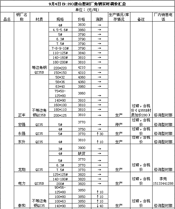 9月4日(9:20)唐山型材厂角钢实时调价汇总