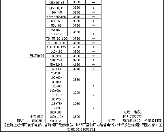 9月3日(9:30)唐山型材厂角钢实时调价汇总