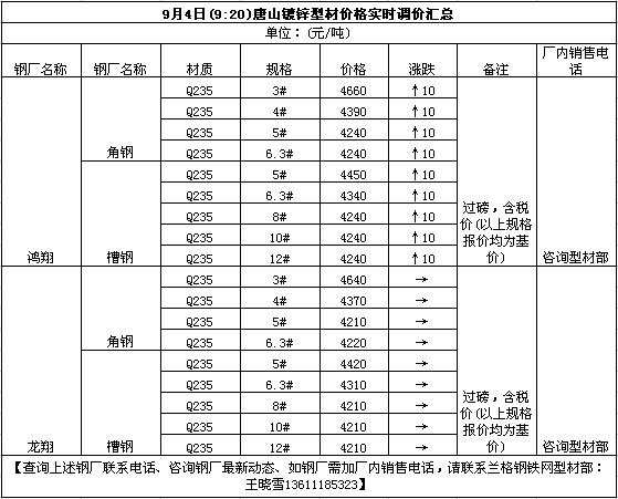 9月4日(9:20)唐山型材厂角钢实时调价汇总
