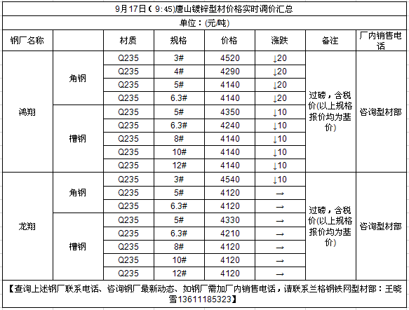 9月17日(9:35)唐山型材厂角钢实时调价汇总表
