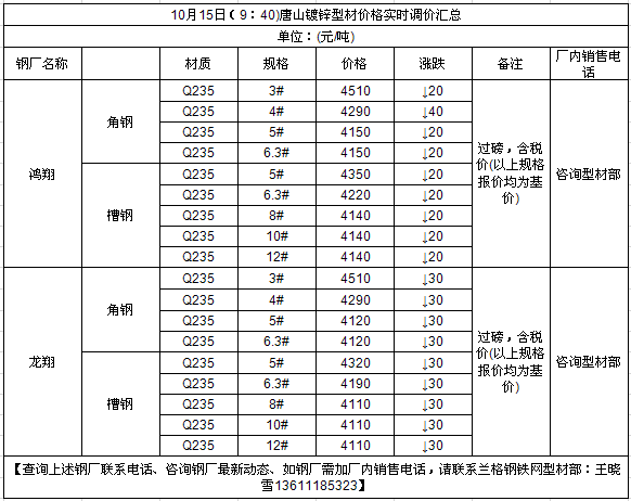 10月15日(9:35)唐山型材厂角钢实时调价汇总表