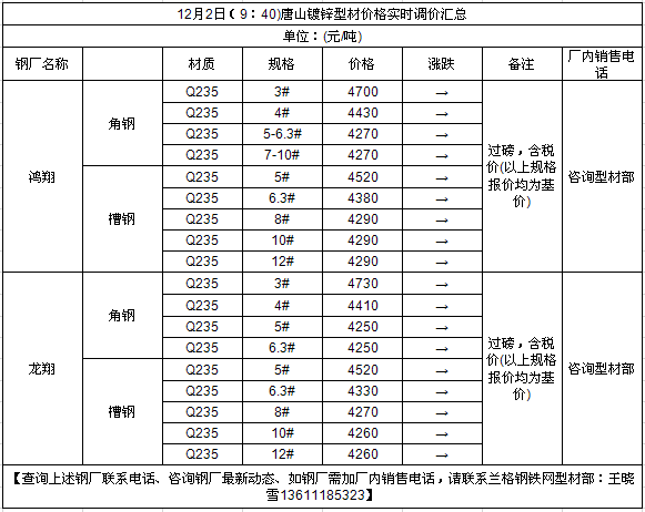 12月2日(9:33)唐山型材厂角钢实时调价汇总表
