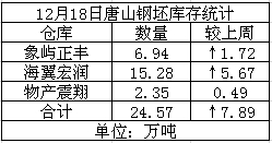 唐山钢坯库存调研:截止12月18日统计三家唐山仓库钢坯库存约24.57万吨,较上周增加7.8万吨。象屿正丰钢坯库存6.94万吨;海翼宏润钢坯库存15.28万吨;物产震翔钢坯库存2.35万吨。