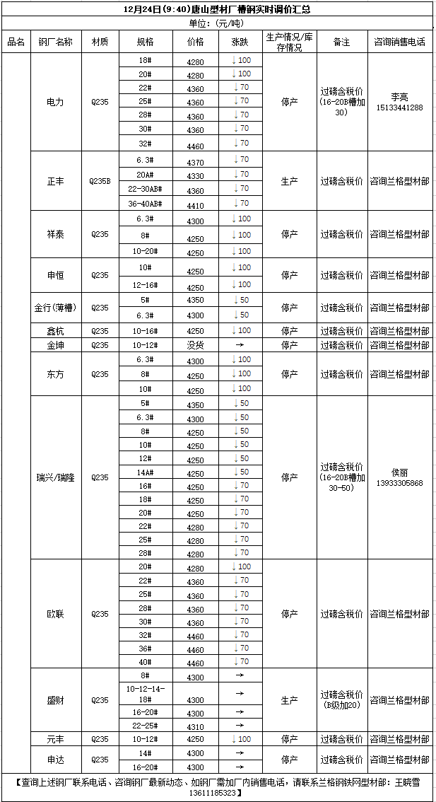 12月24日(9:40)唐山型材厂槽钢实时调价汇总