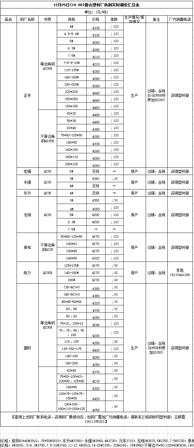 12月25日(10:00)唐山型材厂角钢实时调价汇总表