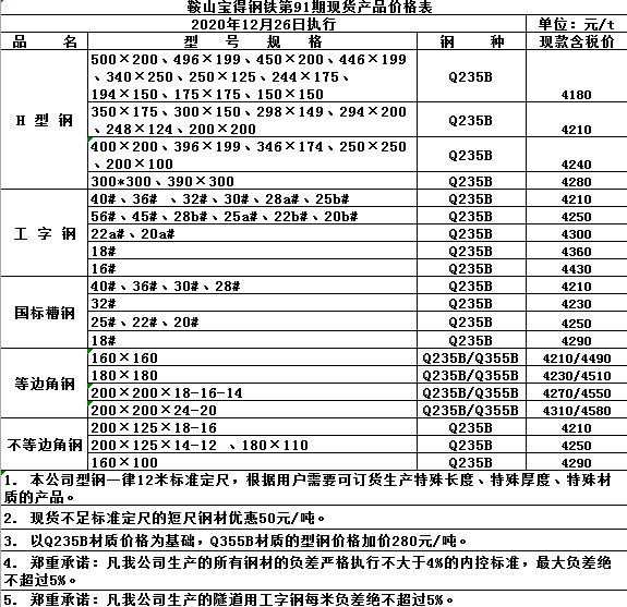 12月28日(9点)唐山型材厂H型钢实时调价汇总
