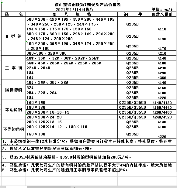 1月13日(9:37)唐山型材厂角钢实时调价汇总表