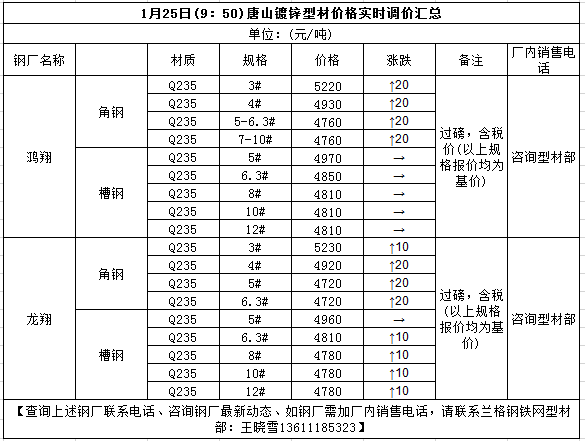 1月25日(9:40)唐山型材厂角钢实时调价汇总表
