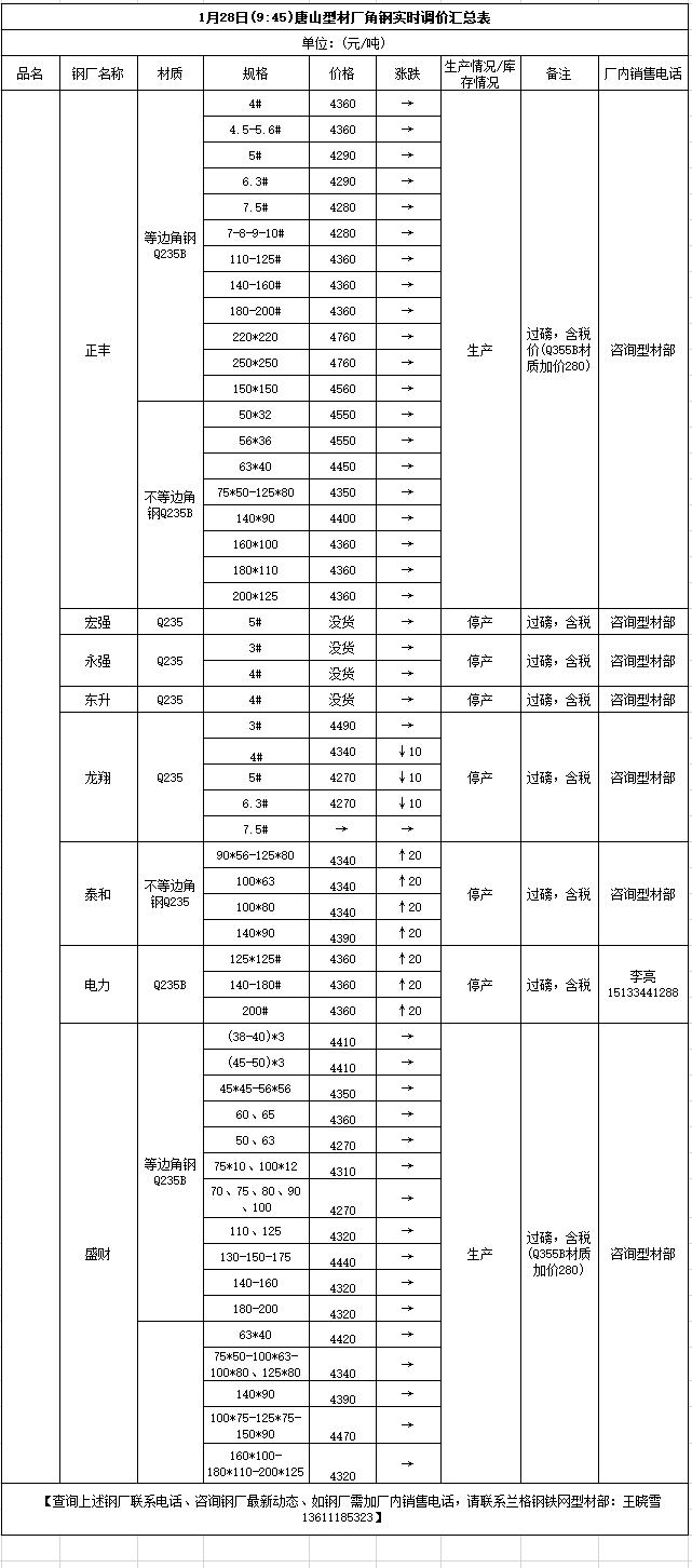 1月28日(9:45)唐山型材厂角钢实时调价汇总表