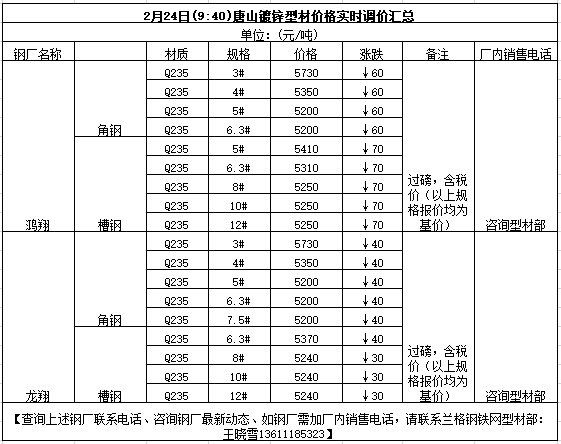 2月24日(9:38)唐山型材厂角钢实时调价汇总