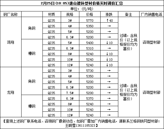 2月25日(9:35)唐山型材厂角钢实时调价汇总