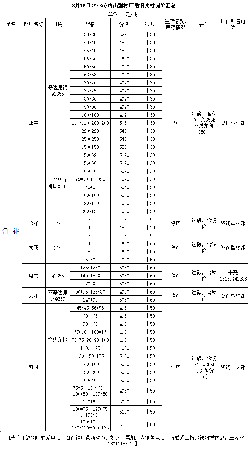 3月16日(9:30)唐山型材厂角钢实时调价汇总
