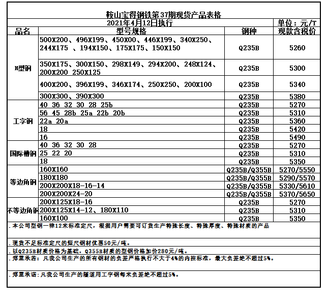 鞍山宝得钢铁第37期现货产品价格表
