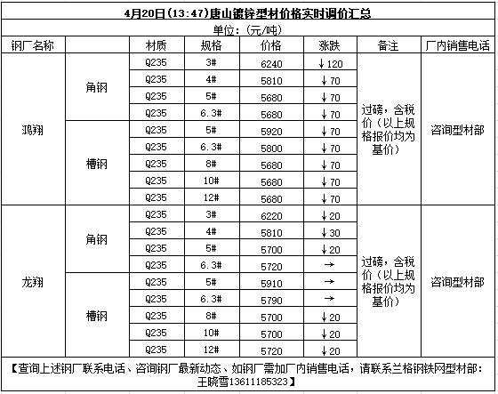 4月20日(9:42)唐山型材厂角钢实时调价汇总