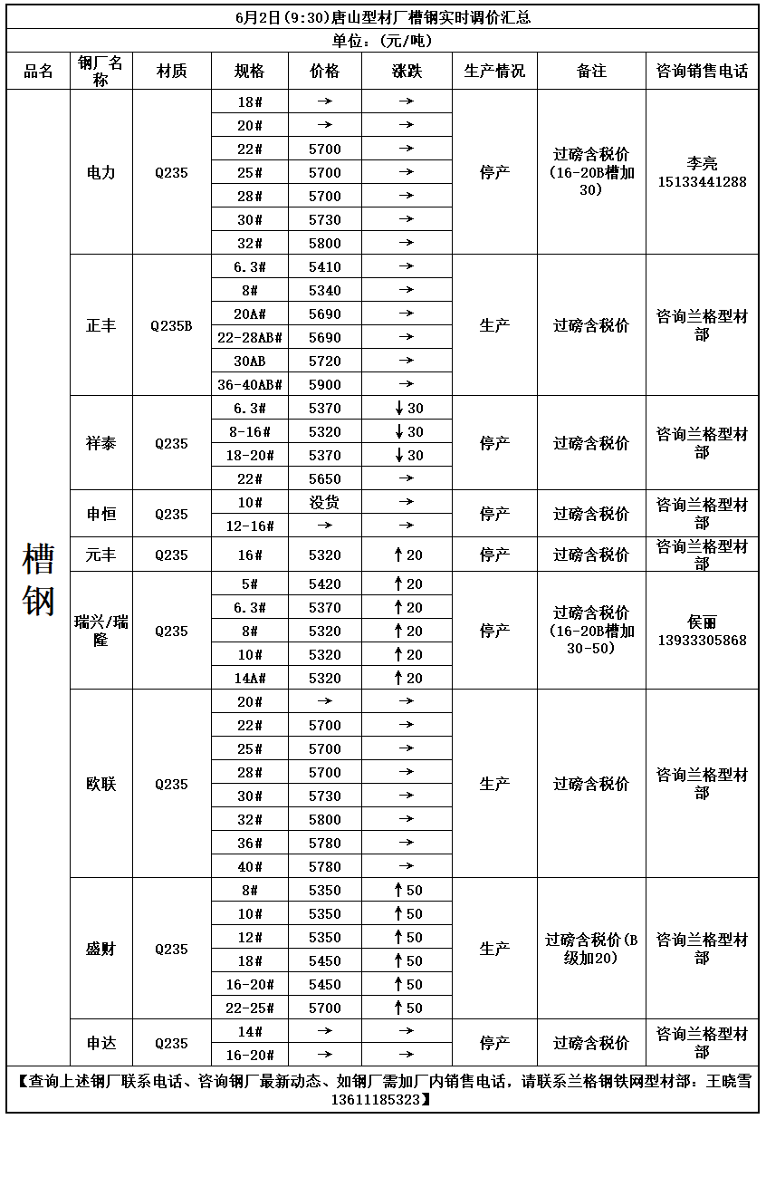 6月2日(9:30)唐山型材厂槽钢实时调价汇总