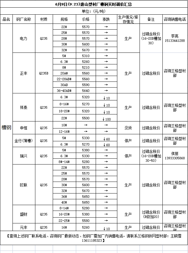 6月9日(9:23)唐山型材厂槽钢实时调价汇总