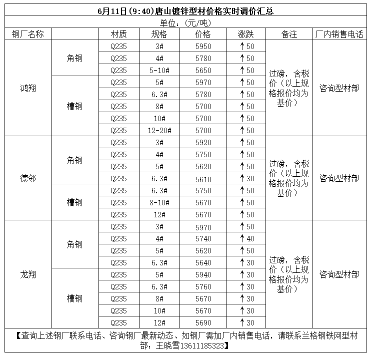 6月11日(9:40)唐山镀锌型材价格实时调价汇总
