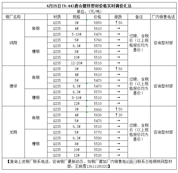 6月25日(9:25)唐山型材厂槽钢实时调价汇总