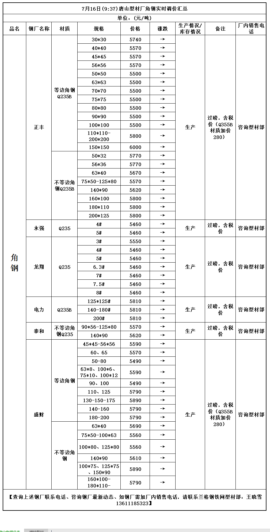 7月16日(9:37)唐山型材厂角钢实时调价汇总