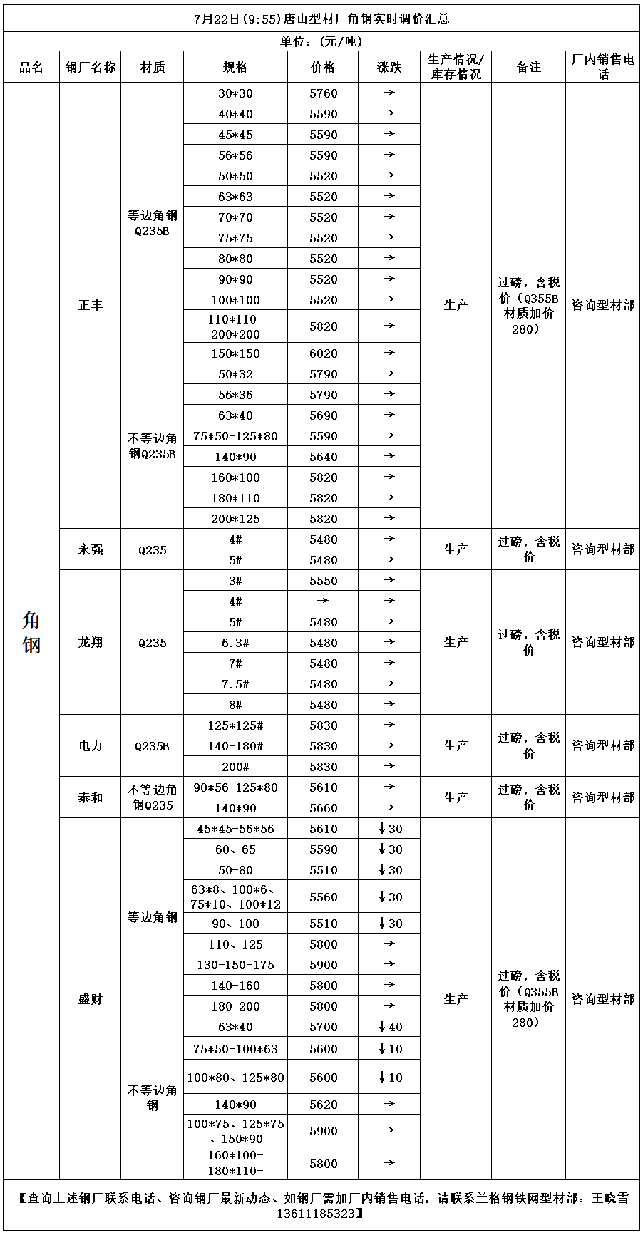 7月22日(9:55)唐山型材厂角钢实时调价汇总