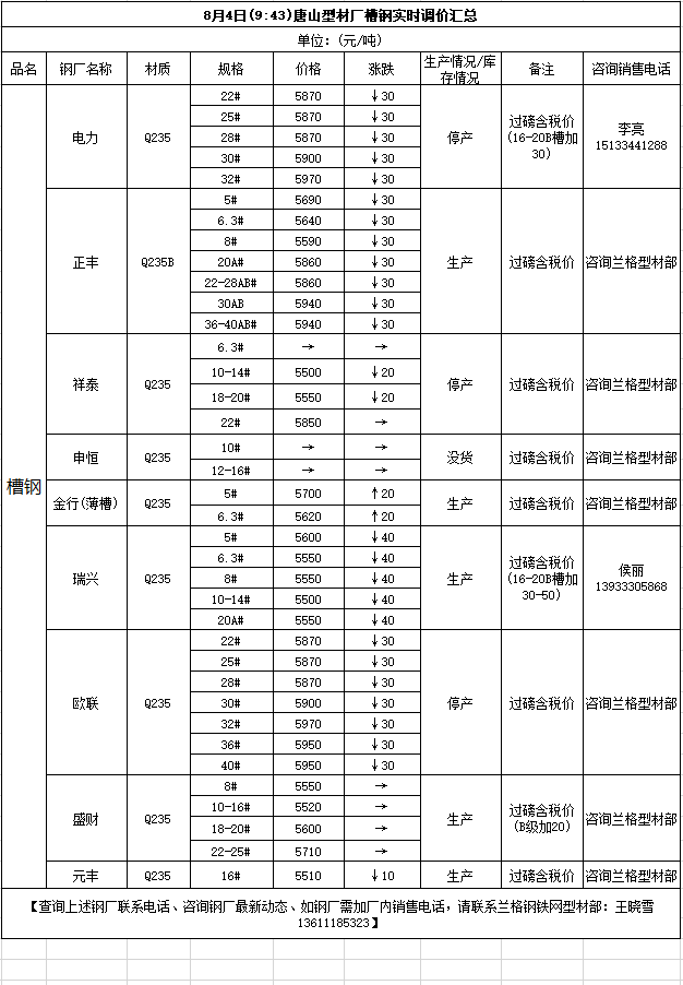 8月4日(9:43)唐山型材厂槽钢实时调价汇总