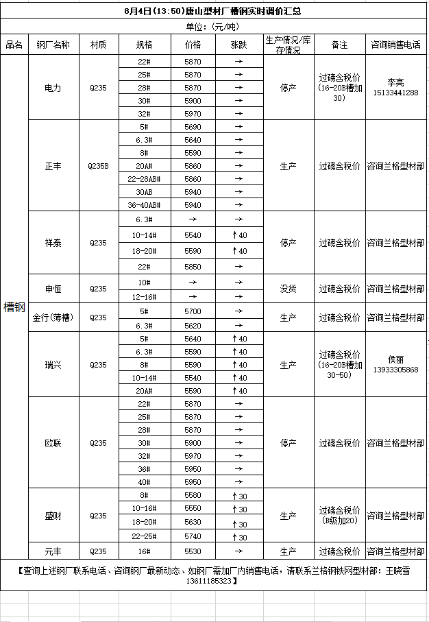 8月4日(13:50)唐山型材厂槽钢实时调价汇总