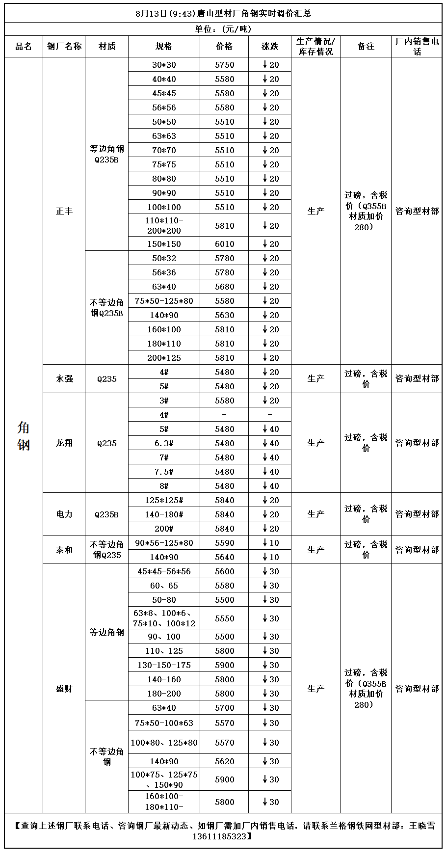 8月13日(9:43)唐山型材厂角钢实时调价汇总
