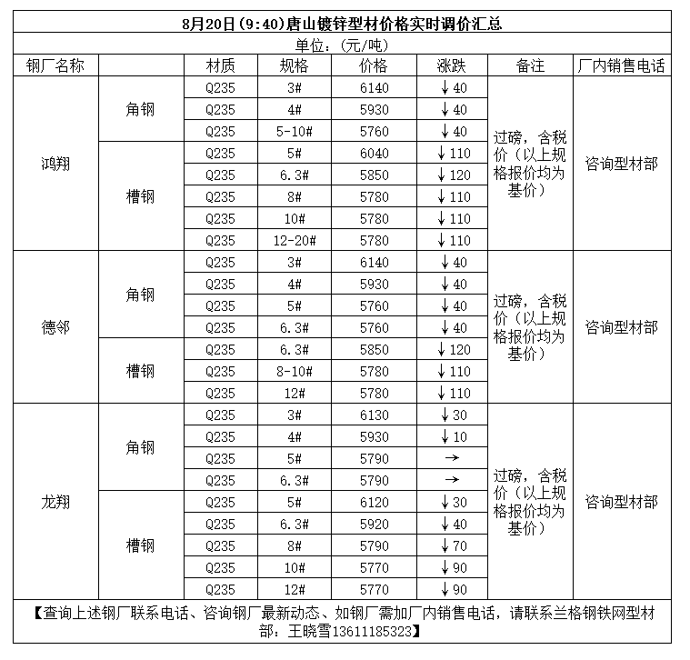 8月20日(9:45)唐山型材厂槽钢实时调价汇总