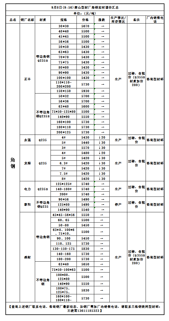 9月8日(9:56)唐山型材厂角钢实时调价汇总