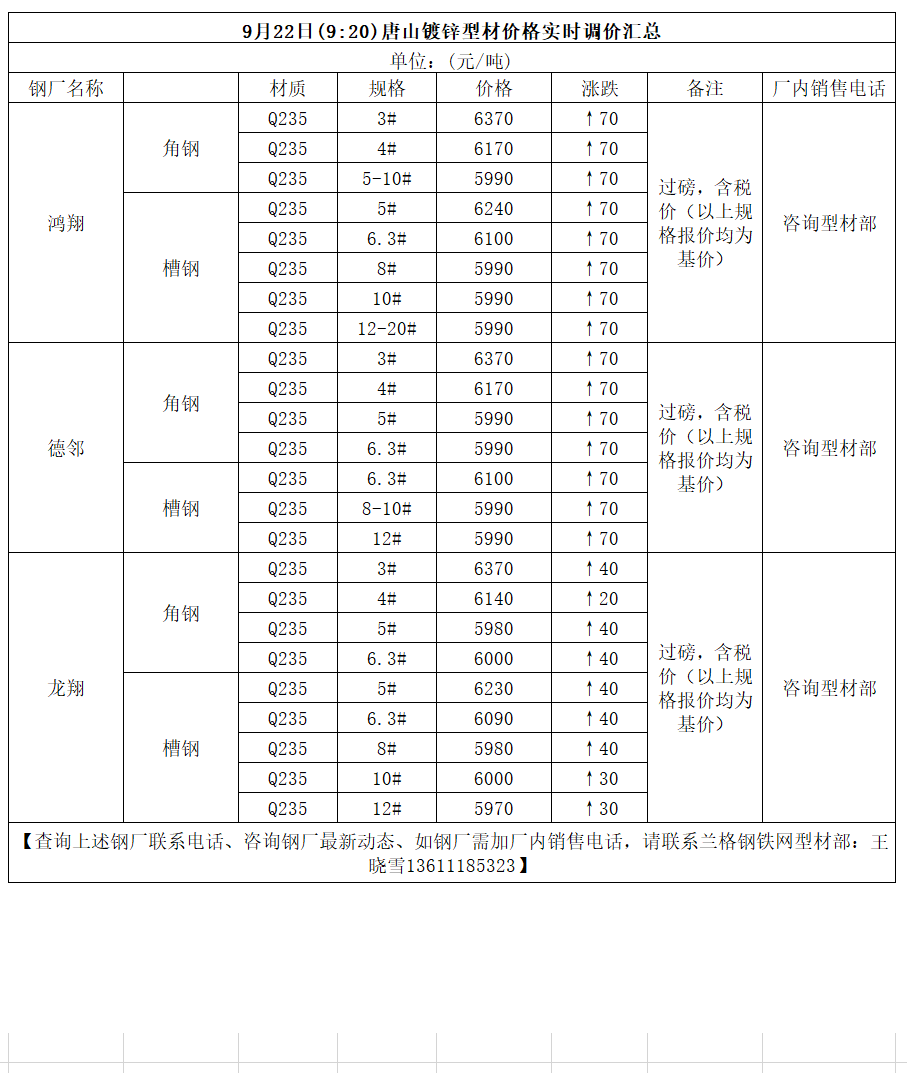 9月22日(9:20)唐山镀锌型材价格实时调价汇总