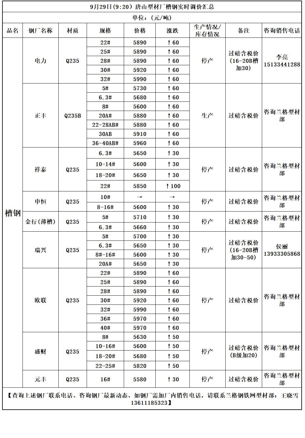 9月29日(9:20)唐山型材厂槽钢实时调价汇总