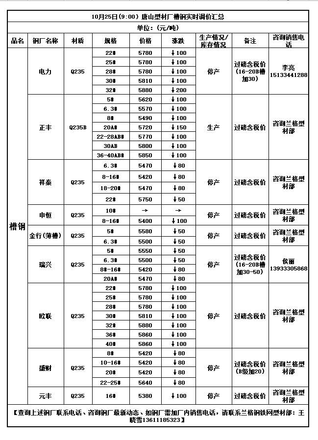 10月25日(9:00)唐山型材厂槽钢实时调价汇总