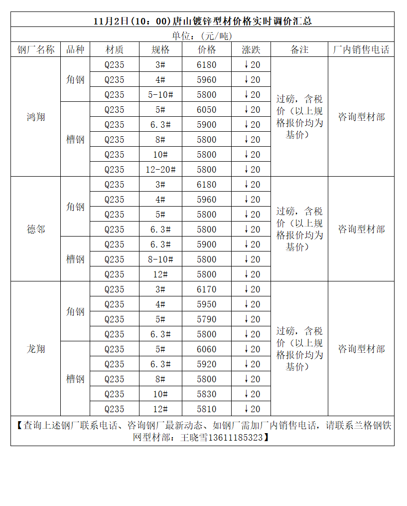 11月2日(9:30)唐山型材厂角钢实时调价汇总